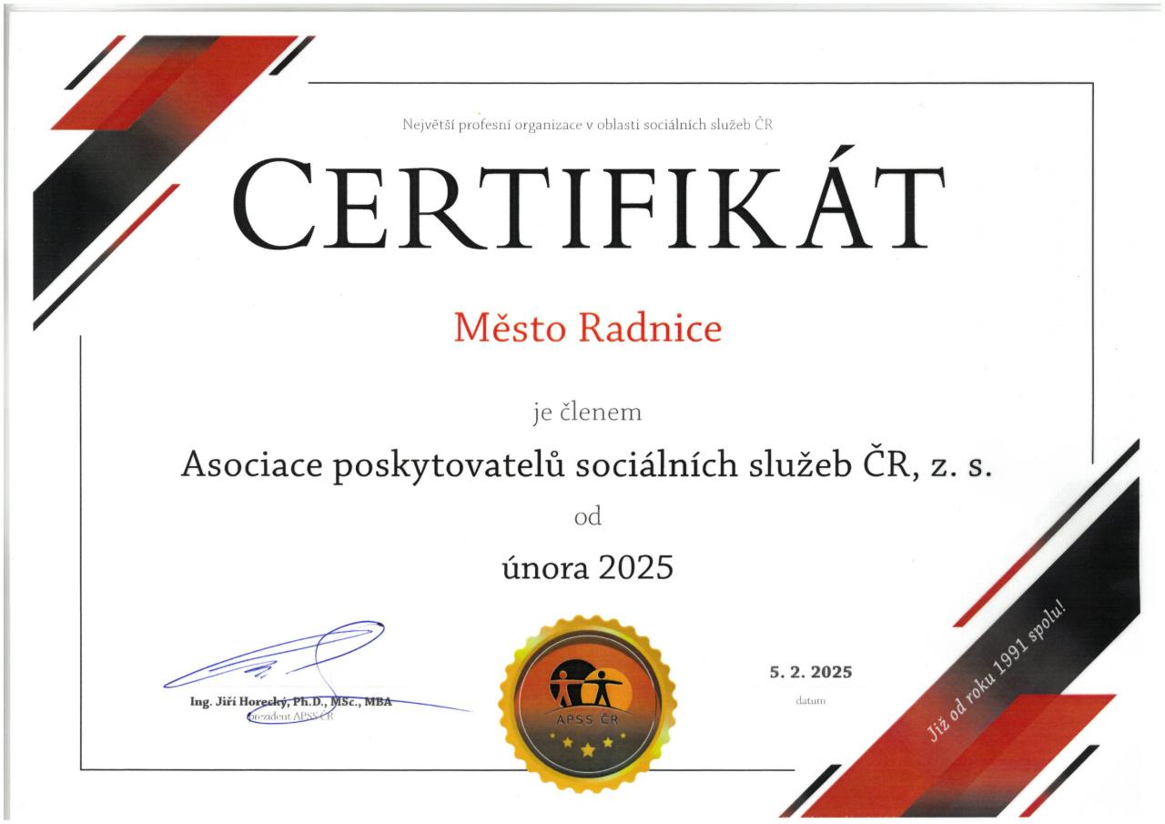 Město Radnice od února 2025 oficiálně vstoupilo do Asociace poskytovatelů sociálních služeb ČR. Tento krok ukazuje na jeho zájem o zlepšení podmínek a kvality sociálních služeb, které jsou poskytovány občanům.