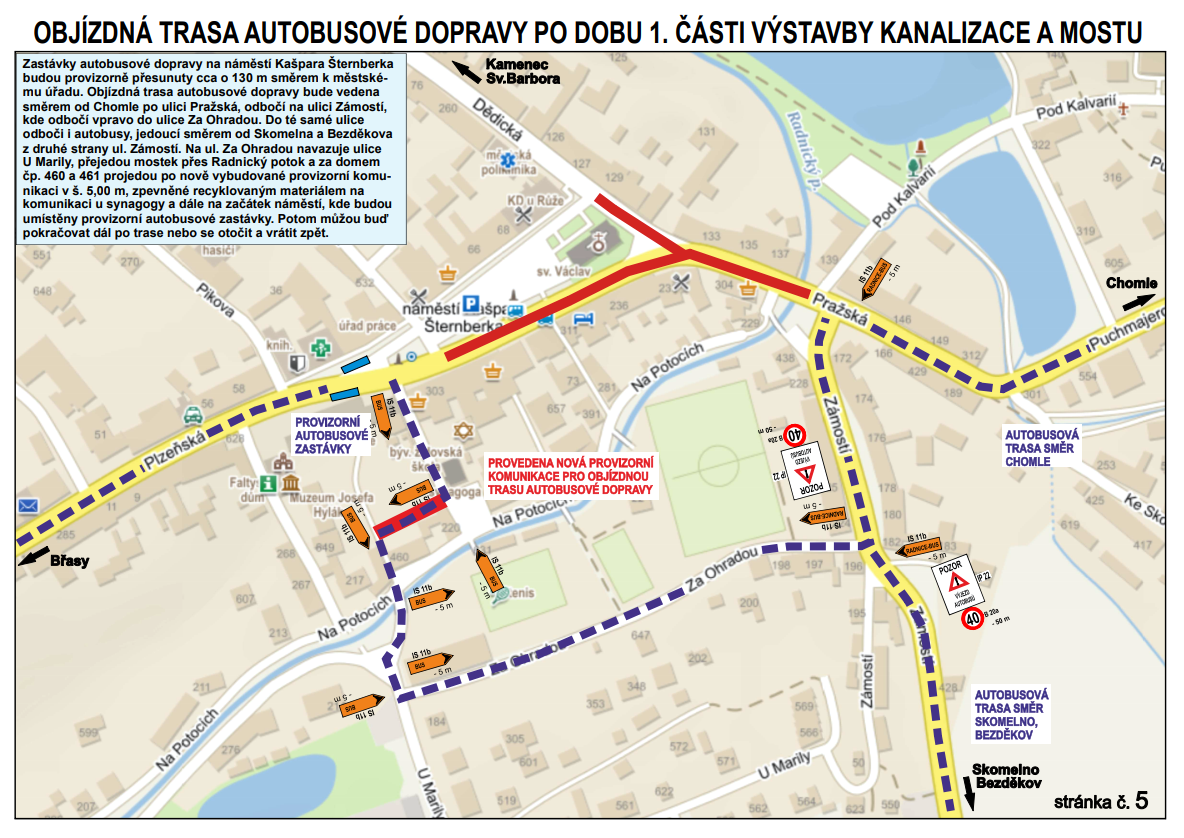 Během první části výstavby mostu a kanalizačního řadu budou zastávky autobusové dopravy na náměstí Kašpara Šternberka provizorně přesunuty z náměstí Kašpara Šternberka cca o 130 metrů směrem k městskému úřadu. Objízdná trasa autobusové dopravy bude vedena směrem od Chomle po ulici Pražská, Zámostí, Za Ohradou. Do této ulice odbočí též autobusy jedoucí od Skomelna či Bezděkova. Poté budou autobusy pokračovat ulicí U Marily, přes most přes Radnický potok a po nově vybudované provizorní komunikaci v šířce pěti metrů, jež je zpevněna recyklovaným materiálem, se napojí autobusy na komunikaci u Radnické synagogy a následně vyjedou na náměstí Kašpara Šternberka, kde budou umístěny provizorní autobusové zastávky.