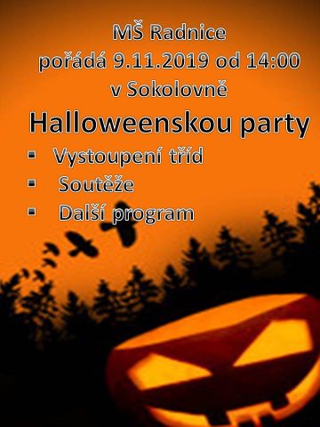 Mateřská škola Radnice pořádá 9. listopadu od 14 hodin v Sokolovně Radnice Halloweenskou party.
