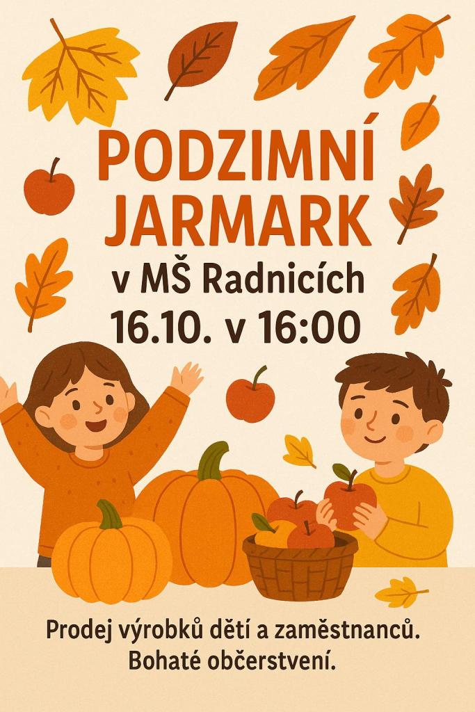 Děti a kolektiv MŠ Radnice vás srdečně zvou na podzimní jarmark. Těšte se na výrobky dětí, koláčky, bramboráky, kávu, čaj, bylinky, mastičky, a další. Přijďte nasát podzimní náladu a pohodu.