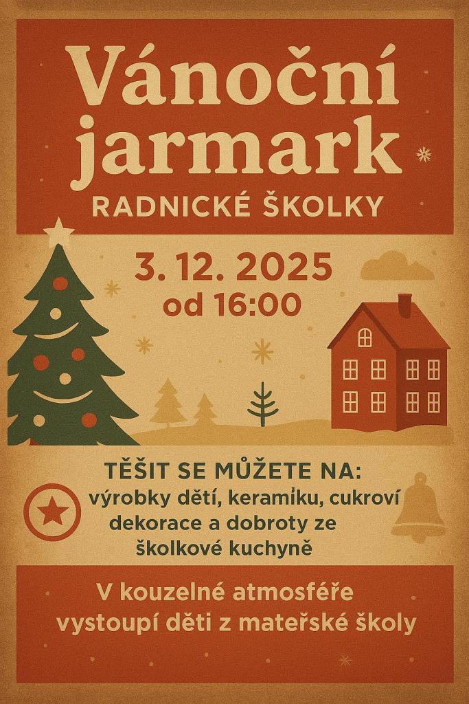 Čeká na vás pravá vánoční nálada včetně kouzelného vystoupení dětí z mateřské školy. Teplý čaj, dobroty ze školkové pekárny, keramika, dekorace a další výrobky dětí. Jste srdečně zváni.