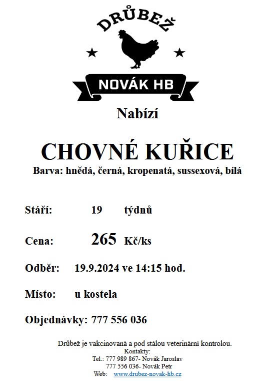 Drůbež Novák HB s.r.o.- drůbežárna Mírovka, prodává ve čtvrtek 19. září ve 14:15 hodin u kostela v Radnicích, nosné kuřice stáří 19 týdnů, cena 265 Kč za kus.