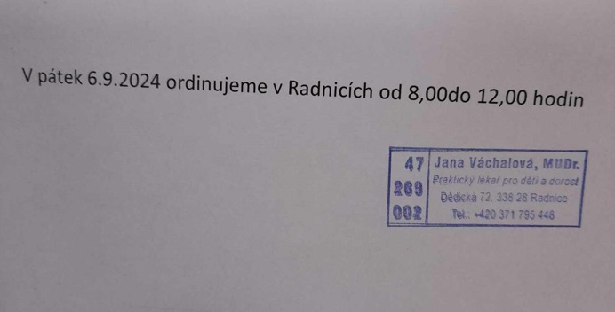 Dětská ambulance ordinuje v pátek 6. září 2024 od 8 do 12 hodin.