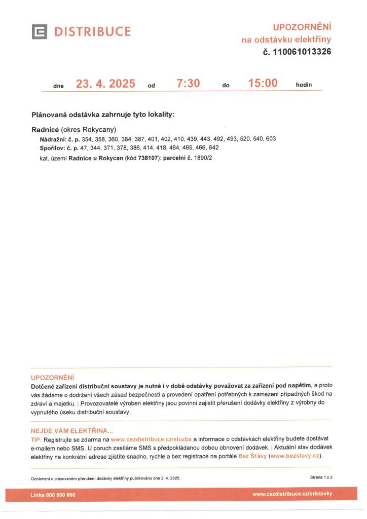 Ve středu 23. dubna proběhne odstávka elektřiny od 7:30 do 15:00 hodin, a to v Radnicích, ulice Nádražní čop 354, 358, 360, 384, 387, 401, 402, 410, 439, 443, 492, 493, 520, 540, 603, Spořilov čop. 47, 344, 371, 378, 386, 414, 418, 464, 465, 466, 642, kat. území Radnice u Rokycan, parc. č. 1890/2.