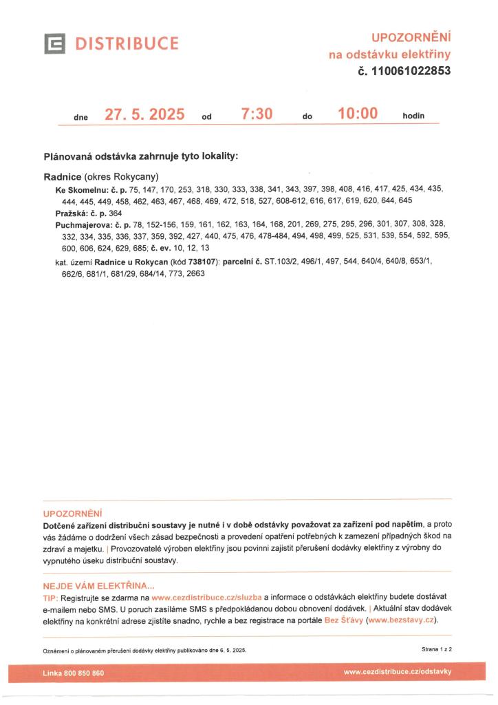 V úterý 27. května proběhne odstávka elektřiny od 7:30 do 10:00 hodin v Radnicích:
