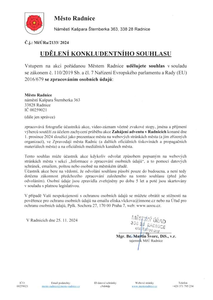 Nejprve před muzeem došlo k odhalení nové postavy v Radnickém betlému. K atmosféře před odhalením přispěli krásným pěveckým pásmem Karolínka a Vojtěch. Slova se ujal Jan Irving, který přiblížil přítomným postavu operní pěvkyně Gabriely Roubalové, přezdívané La Boema. Právě ona je letošní novou postavou v betlému. Poté se program přenesl na náměstí, na kterém probíhaly trhy. K dispozici byl horký svařák, medovina, zákusky, uzeniny a další různé vánoční zboží. Poté se již slova ujal starosta města Jan Altman, který popřál občanům krásné vánoční svátky a u kostela se rozsvítil vánoční strom. S vánočním pásmem v kostele svatého Václava vystoupily děti z mateřinky a poté z devítiletky. Krásné sváteční odpoledne bylo zakončeno kytarovým koncertem Lukáše Svobody a Jana Irvinga.